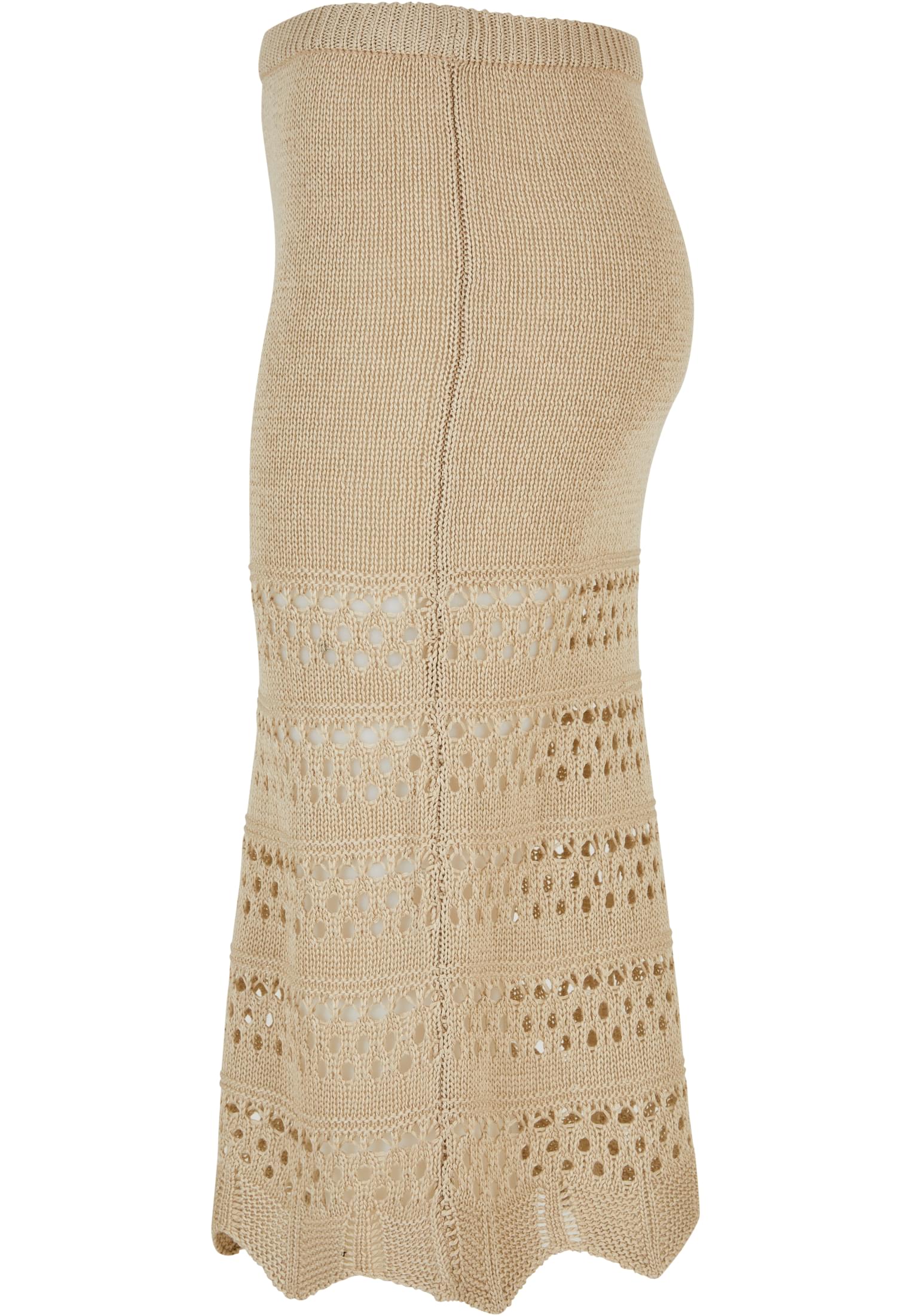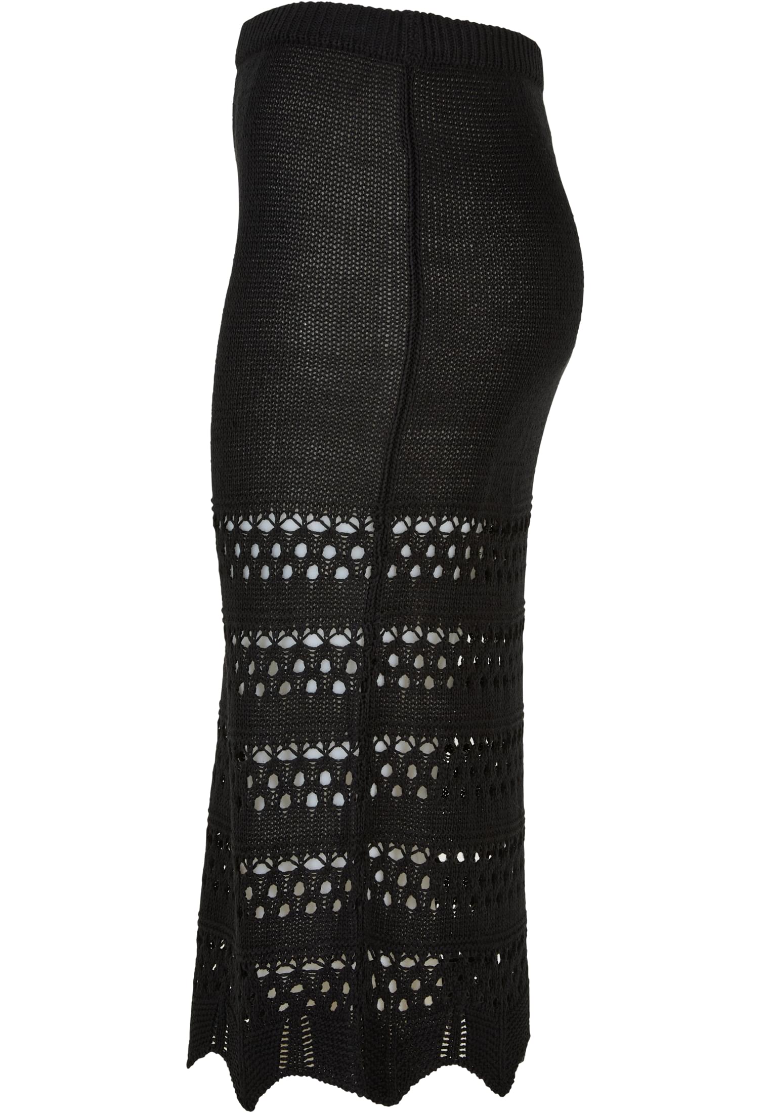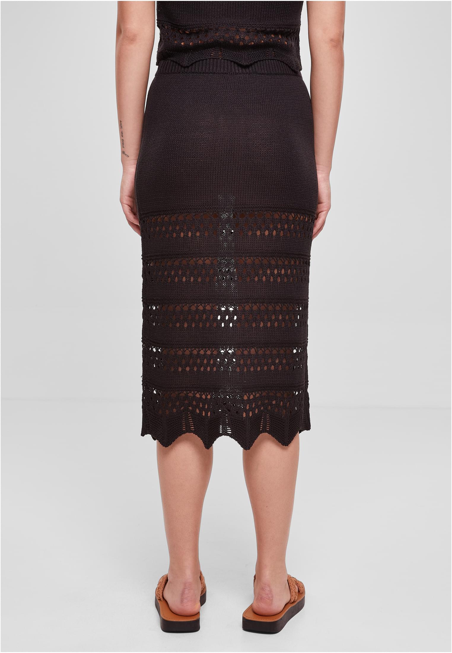Denna charmiga virkade stickade kjol är delad i två områden. Den övre delen, med minikjollängd, är ogenomskinlig tack vare ett respektive virkade mönster. Under detta faller en elegant virkad mönstring i 3/4-längd över knäna och avslutas med en skicklig vågform. Det använda materialet är fin akryl. Snittet är en bekväm slim fit.