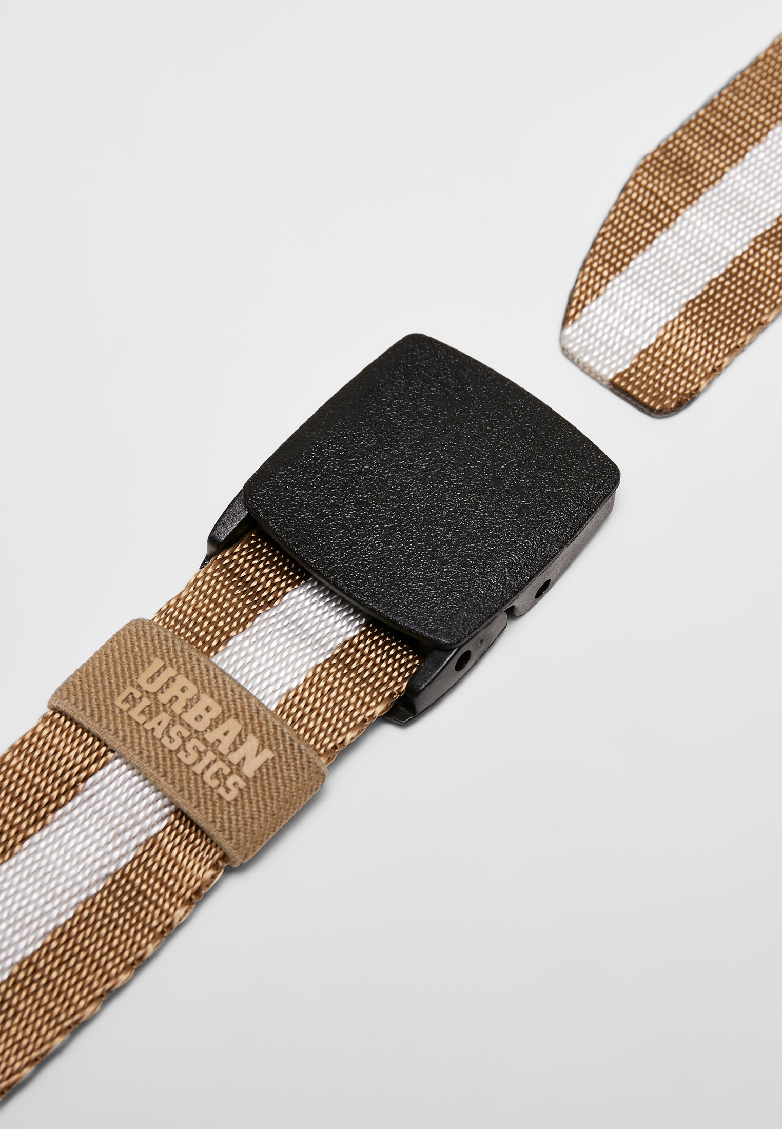 Detta bälte har en enkel men stilren design i svart, som bryts av av en bred, horisontell rand i vitt. Bältet är tillverkat av ett lätt skimrande och slitstarkt polyester material. Det levereras i två storlekar, S/M 110cm och L/XL 130cm, och kan enkelt justeras med hjälp av en robust och dold spänne.