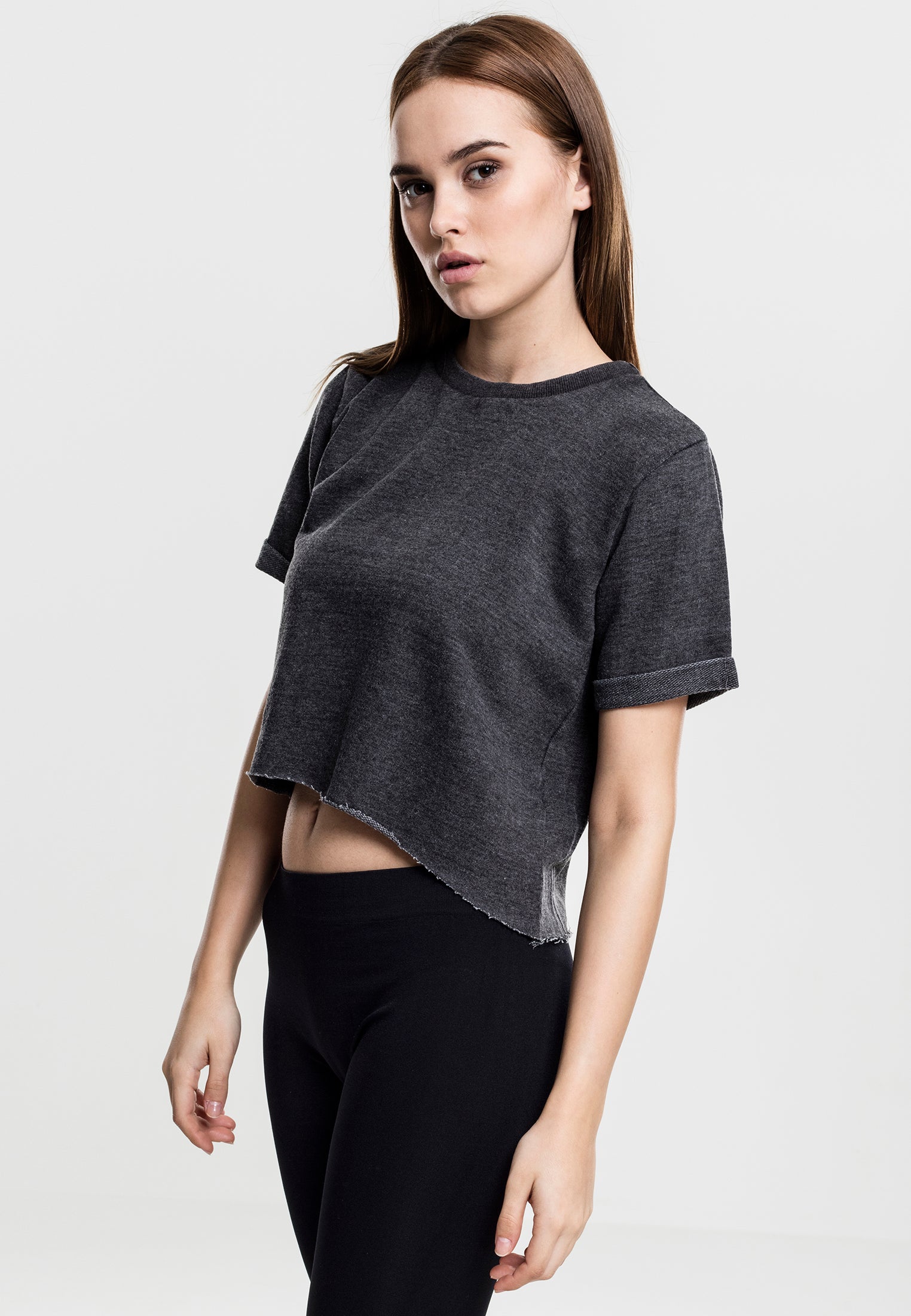 Denna kortärmade tröja har en trendig, croppad passform med en något längre bakdel och en lätt oversized look. Råkanter vid fållen, en vid rund halsringning och uppvikta ärmslut ger ett avslappnat och stilrent uttryck.