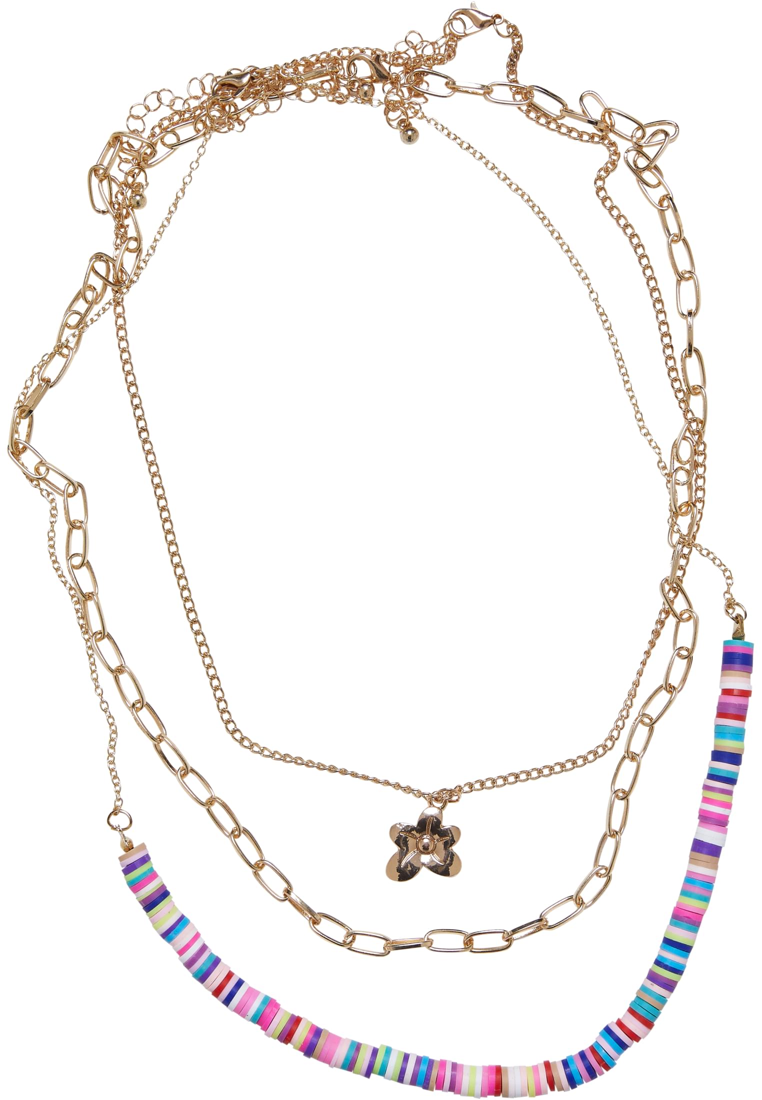 Detta vackra halsbandsset ger blomsterkraften nytt liv. Bäraren får en attraktiv sammansättning av tre individuella kedjor som passar ihop på ett harmoniskt sätt. Den innersta kedjan består av små, gyllene kedjelänkar och håller hjärtat i setet: en gyllene blomma. Den andra kedjan har många färgglada plastringar och åtföljs av den tredje kedjan som är gjord av förgyllda kedjelänkar.