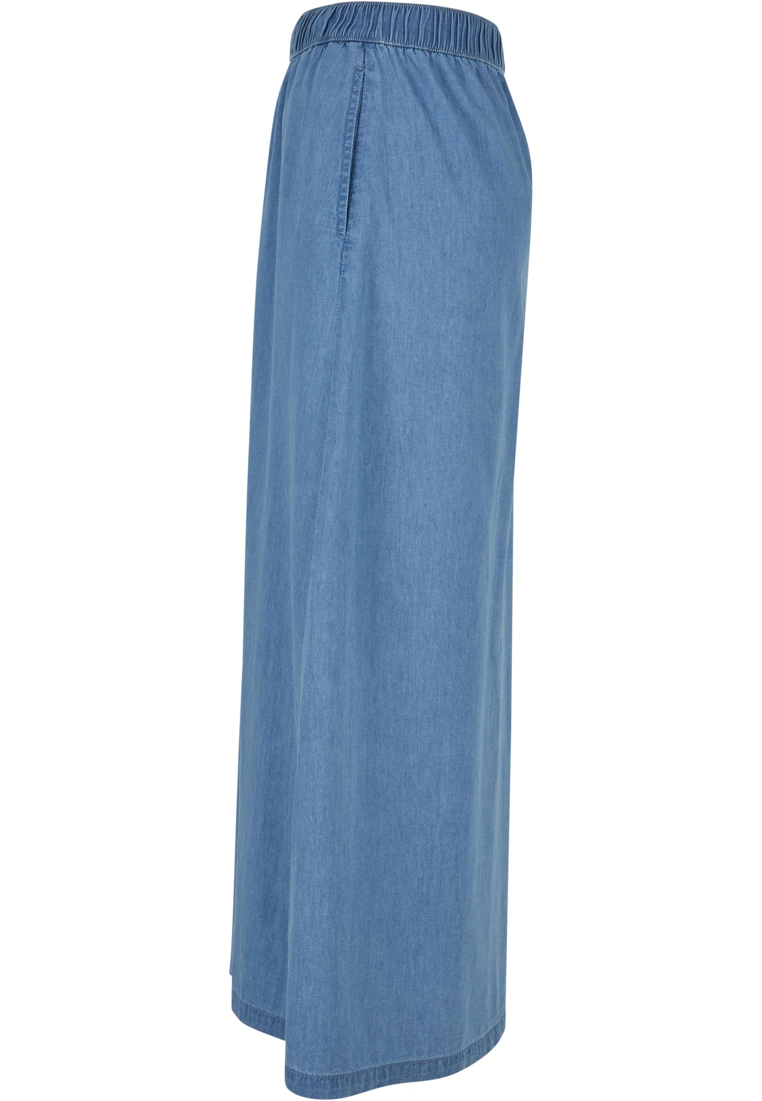 Denna distinkta jeanskjol har en knappslå med metallknappar i mitten. Knappslån är dock inte nödvändig för att ta på sig kjolen, eftersom den också har ett elastiskt midjeband som stretchar efter behov. Kjolen har en lös passform och slutar ovanför anklarna, samt är utrustad med två sidofickor. Det använda materialet är lätt denimbomull.