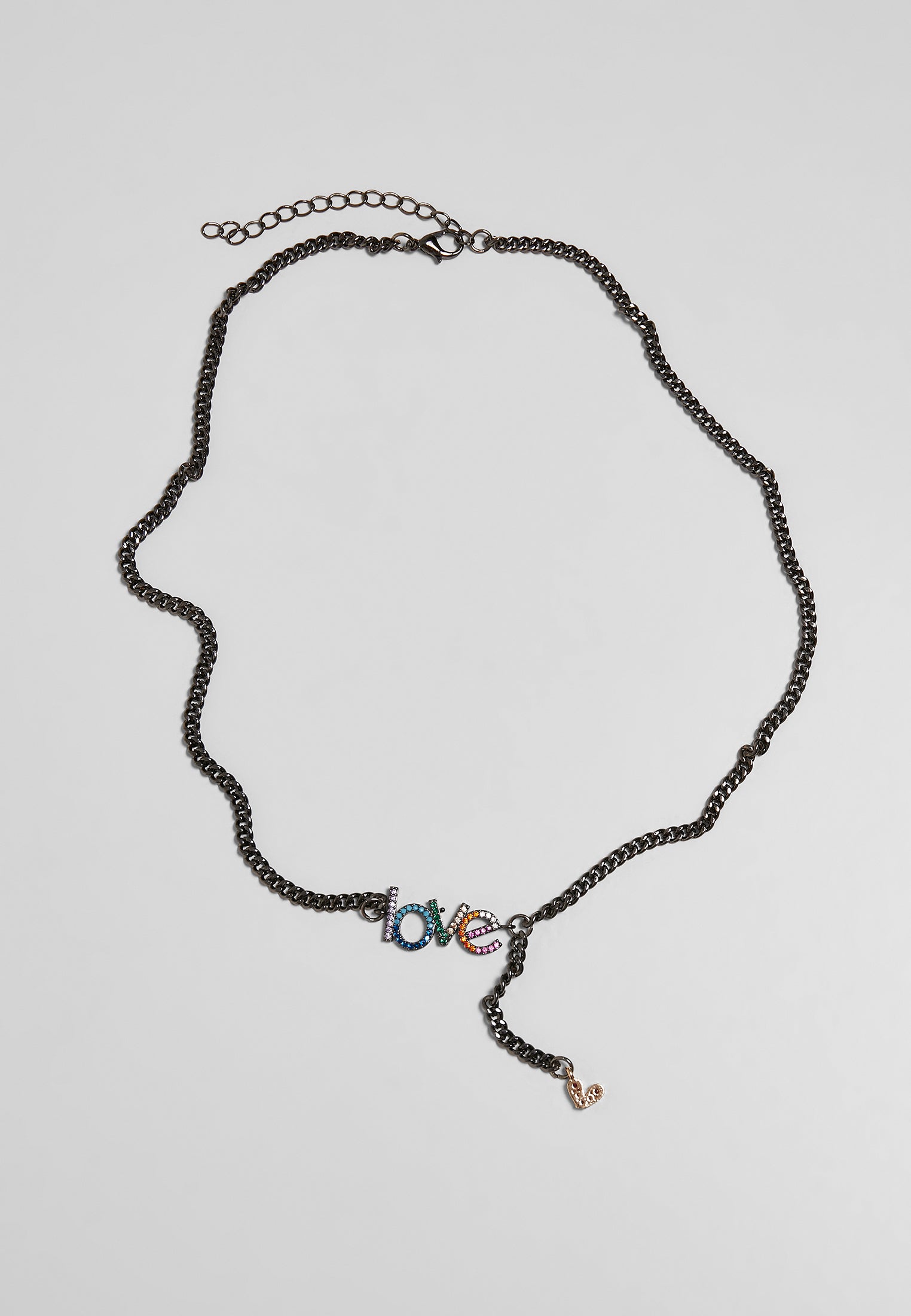 Detta modesmycke utstrålar både charm och känsla med sitt vackra "love"-hänge som pryds av färgglada stenar – ett tydligt budskap i en elegant form. Halsbandet är utformat som en platt, harmonisk pansarkedja och bärs i medellängd med en total längd på 47cm, samt en 7cm lång förlängningskedja för justerbar passform. Under hänget hänger en tunn kedja ned som avslutas med ett litet hjärtformat hänge i rosa och guldfärg – en romantisk detalj som förstärker smyckets uttryck.