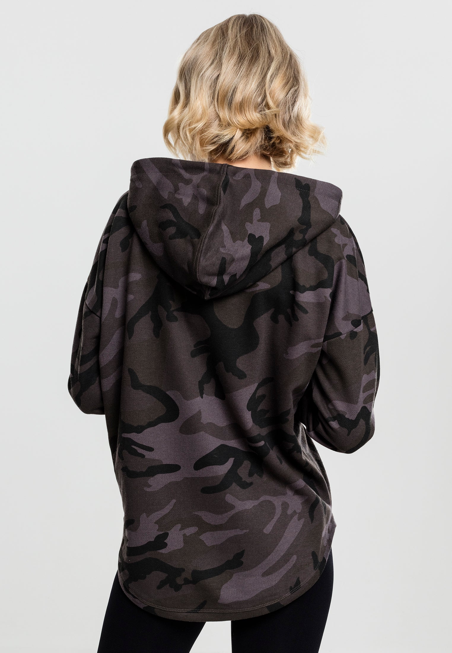 Ladies Oversized Camo Hoody kombinerar två av de mest populära urbana stilarna: en oversized passform och en subtil camouflagemönster. Den mjuka terrytyget ger både komfort och stil, medan den rundade fållen både fram och bak ger en avslappnad och löst passform. Sätt-i ärmsömmarna och den breda ribbade nederkanten kompletterar den avslappnade looken och gör denna hoody till ett måste i din garderob.