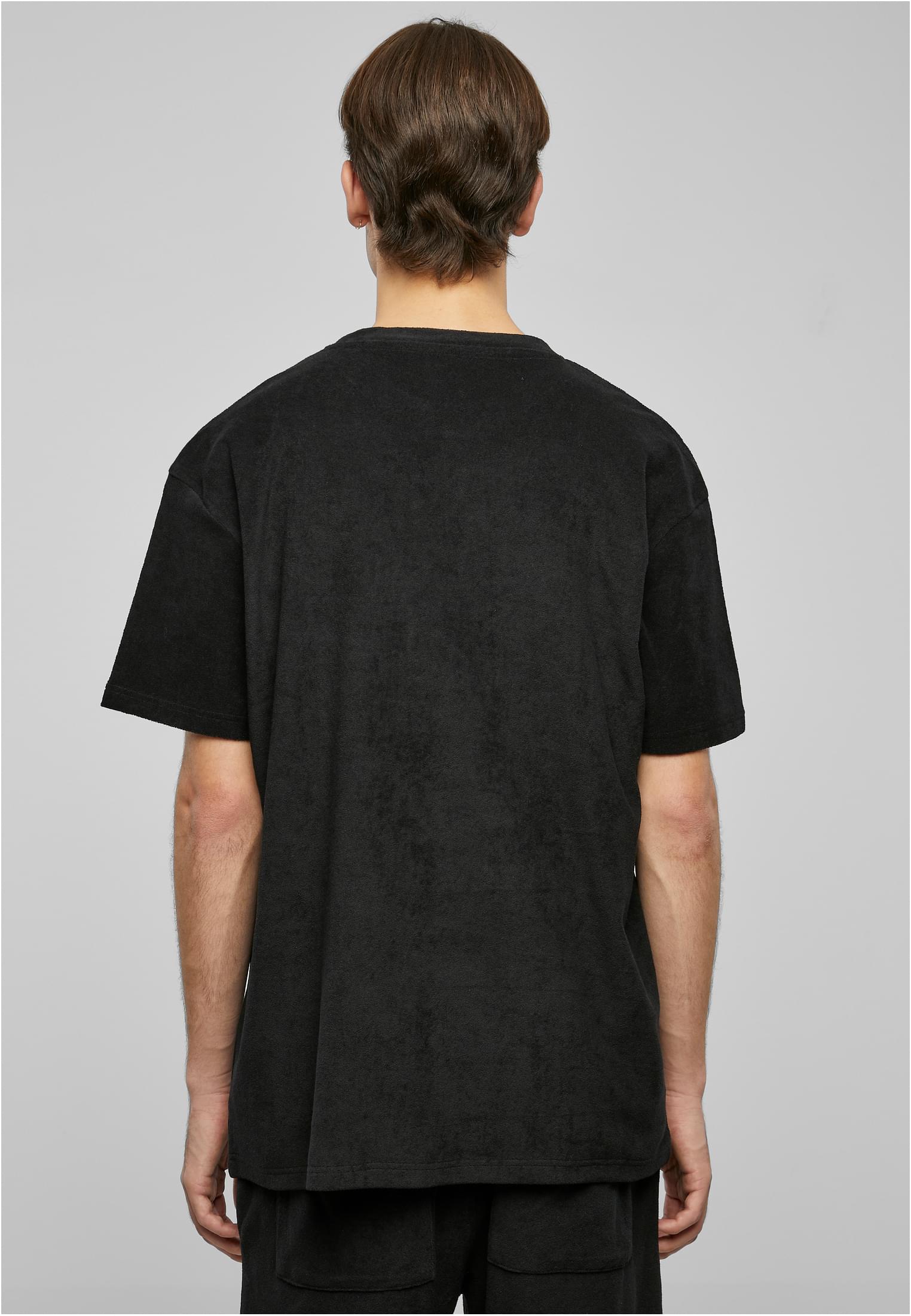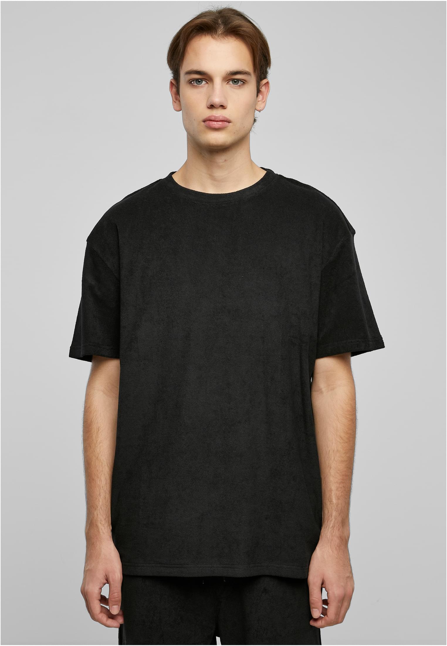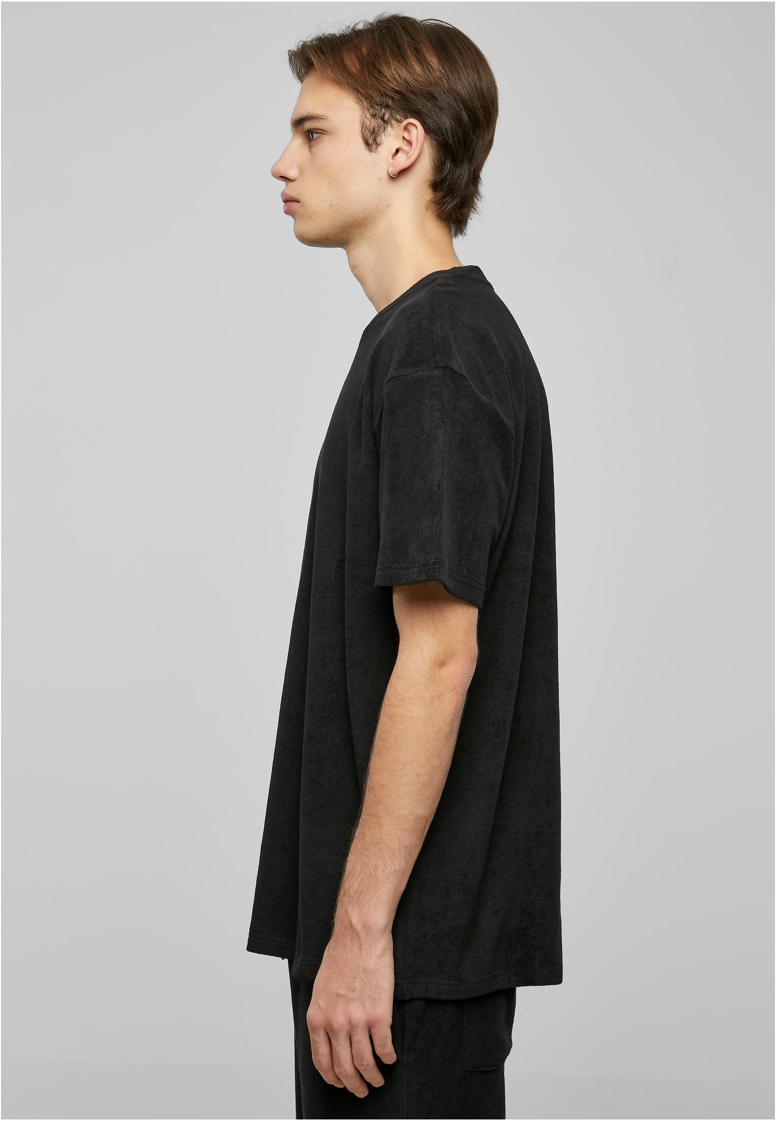 Denna ensfärgade t-shirt för herr är designad i en avslappnad oversize passform med nedhasade axlar, samt med en klassisk rund hals och ärmar som slutar strax ovanför armbågen. Den speciella bärkomforten kommer från det använda handduk-bomullsmaterialet.