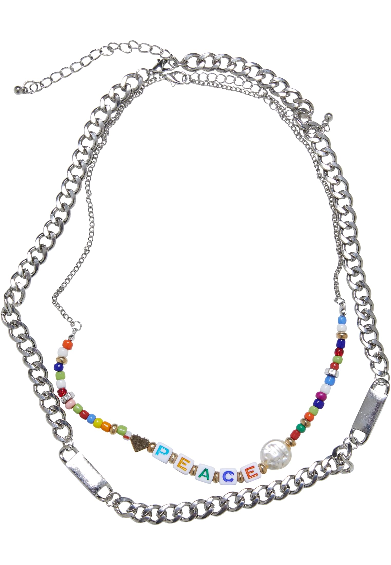 Detta smyckeset i två delar ger en lekfull och trendig touch till din outfit. Det består av två olika halsband som kan bäras tillsammans eller var för sig. Det större halsbandet har kraftigare länkar i klassisk kedjedesign, medan det mindre är mer finstämt med färgglada plastpärlor och texten "Peace" som skapar en glad och avslappnad känsla. Perfekt för att ge din stil ett personligt uttryck.