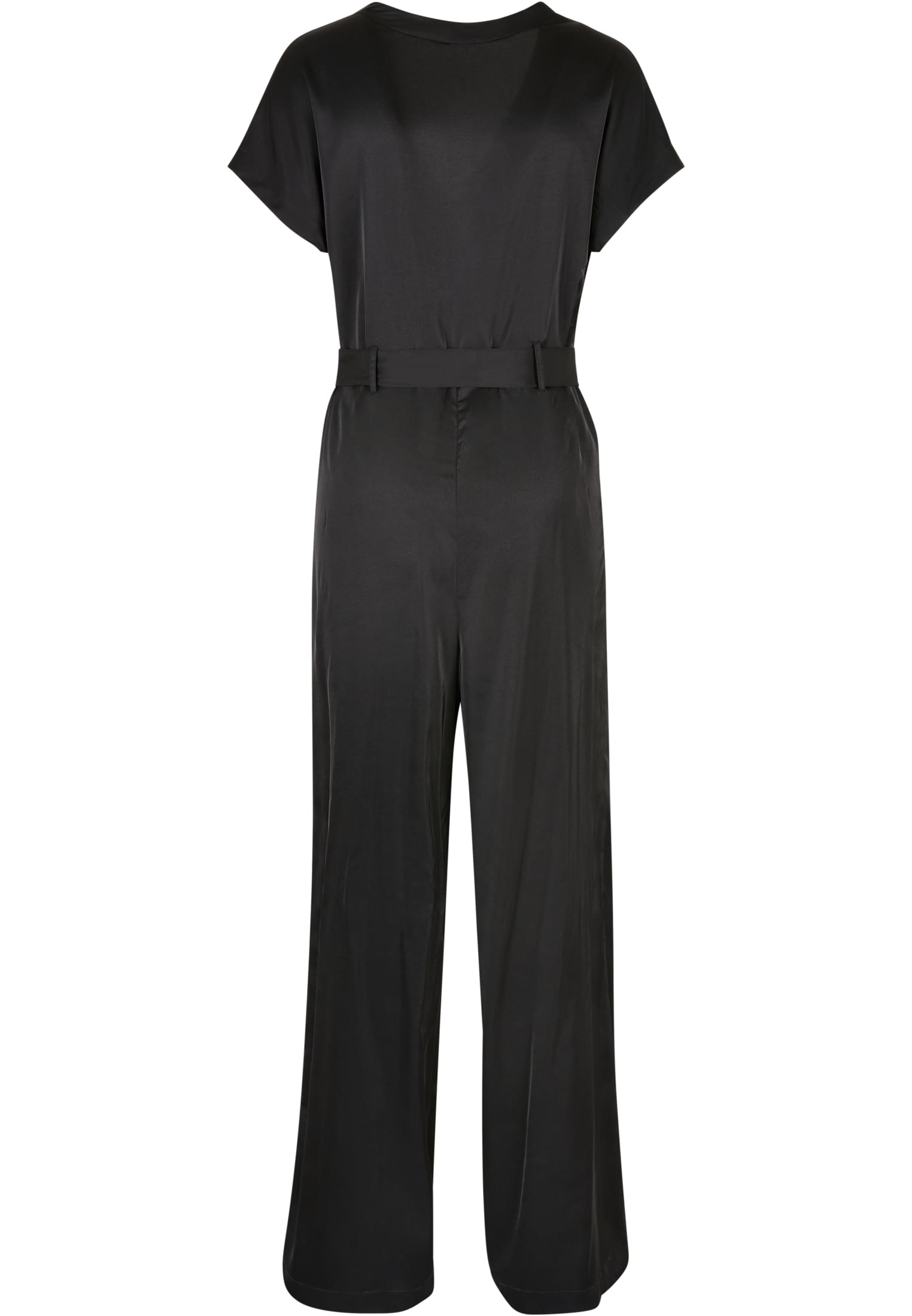 En elegant jumpsuit i enfärgad, skimrande satin som ger en lyxig känsla. Midjan markeras med ett tygbälte med D-ringar, som hålls på plats av bälteshällor. Den V-formade halsringningen avslutas med en dold knappslå för en stilren look. Byxbenen har en rak och vid passform som skapar en sofistikerad silhuett. Designen fulländas med korta, avsmalnande ärmar och praktiska sidofickor. Den lösa passformen ger både komfort och elegans.