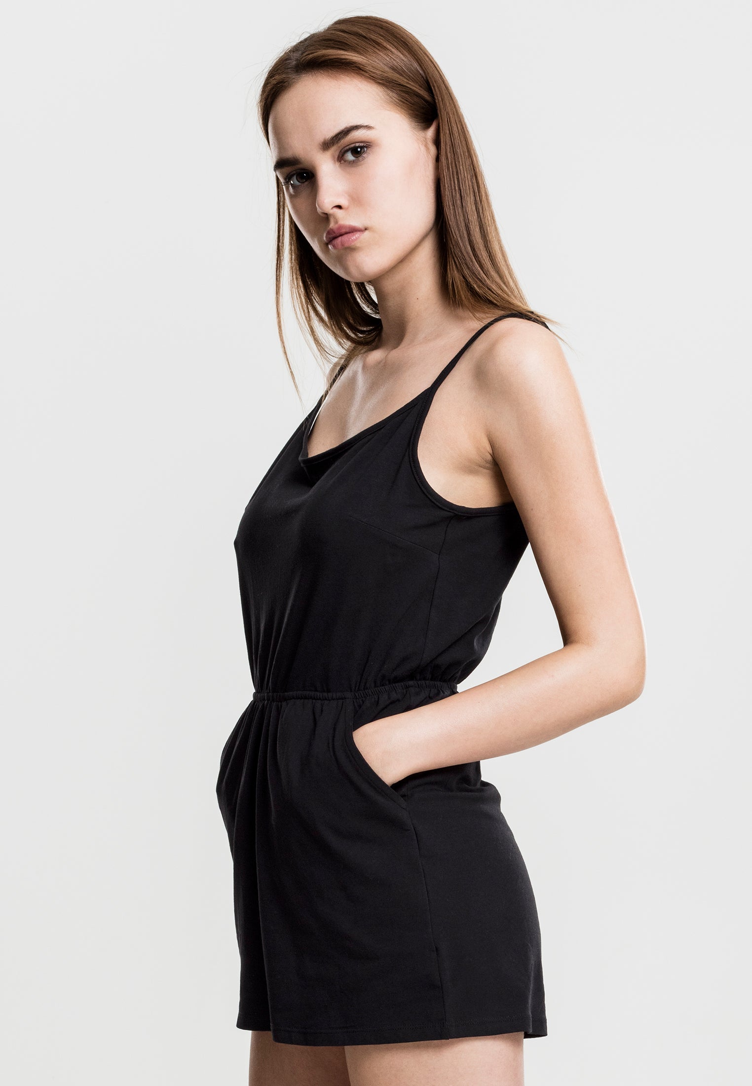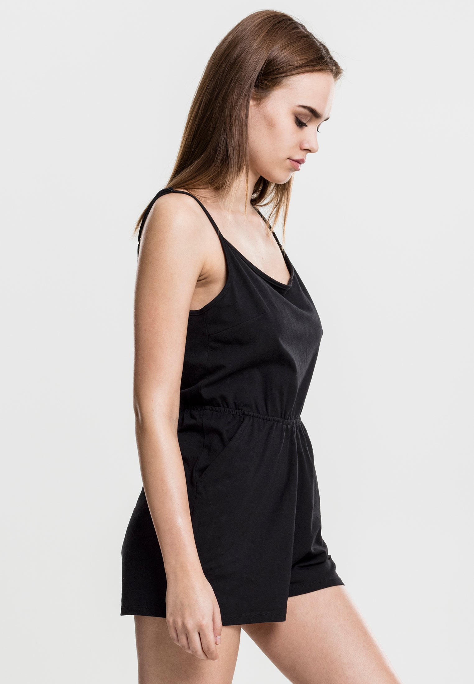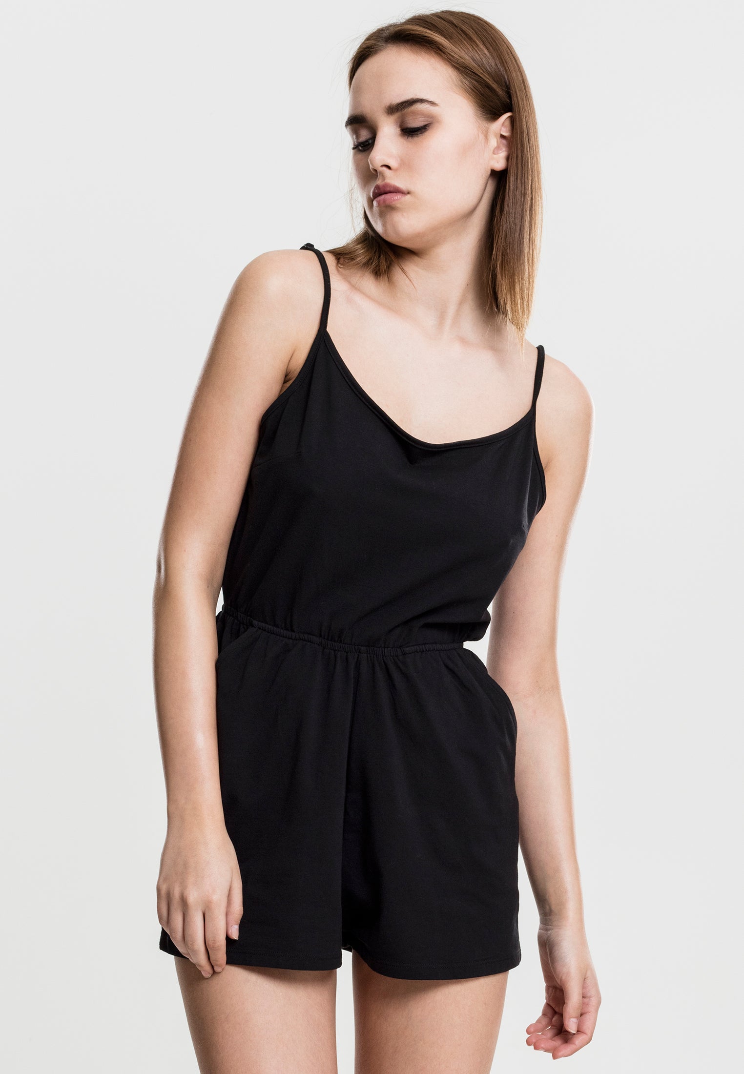Med denna Ladies Short Spaghetti Jumpsuit från URBAN CLASSICS är du perfekt klädd för både stranden och staden – den är helt enkelt het. De korsade smala spaghetti-axelbanden på baksidan framhäver den feminina stilen. Den elastiska midjan säkerställer en bra passform och det mjuka stretchjerseytyget ger hög komfort. En trendig basvara där du ser fantastisk ut.