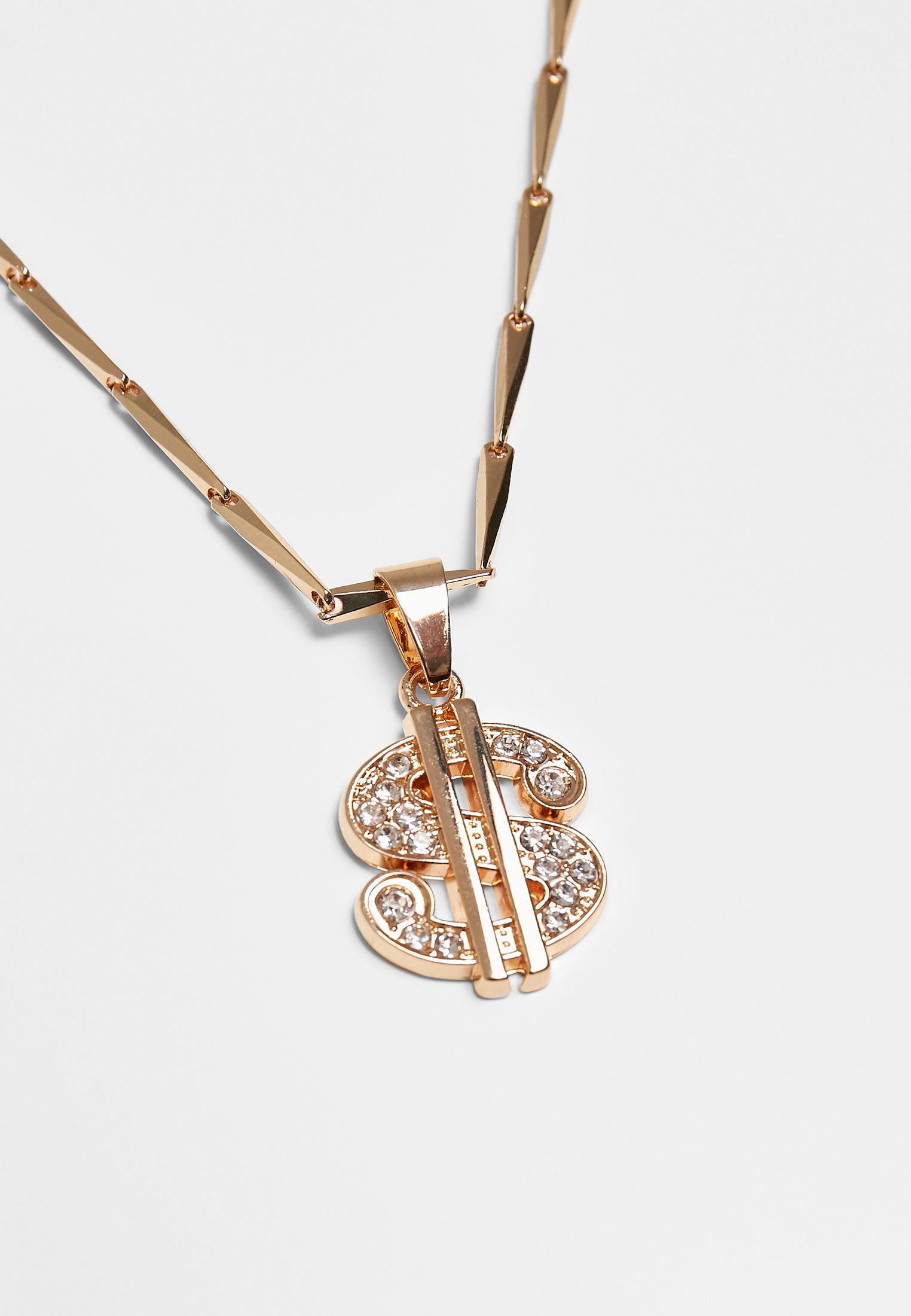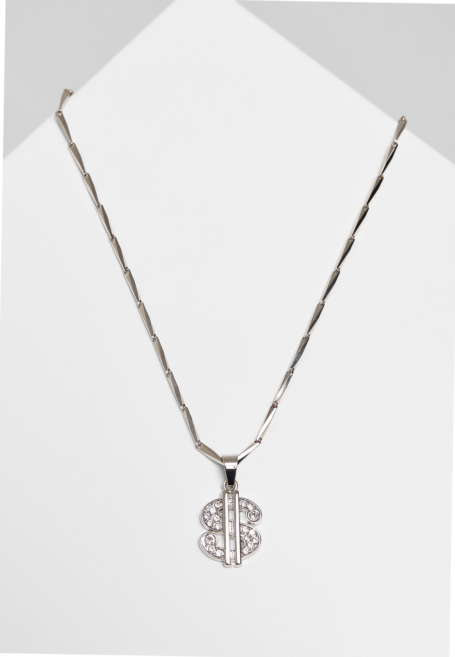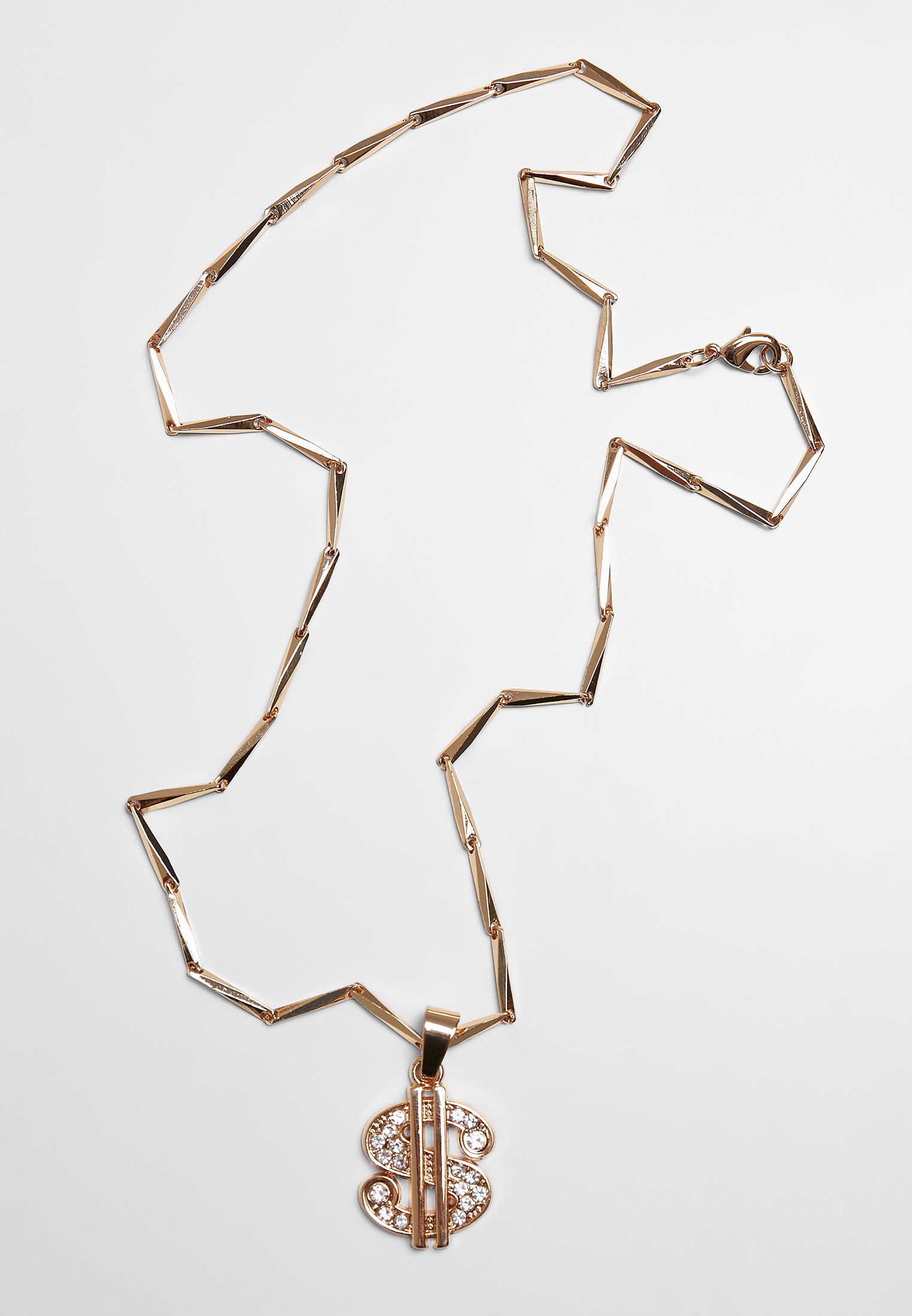 Det autentiska halsbandet med sin glittrande dollar-symbol hänger på en kedja prydd med glittrande rhinestones och gör ett tydligt urbant uttalande. De förlängda länkarna passar perfekt ihop och kompletterar kedjans metropolitan-look med stil. Halsbandet är tillverkat av mässing och en zinklegering.