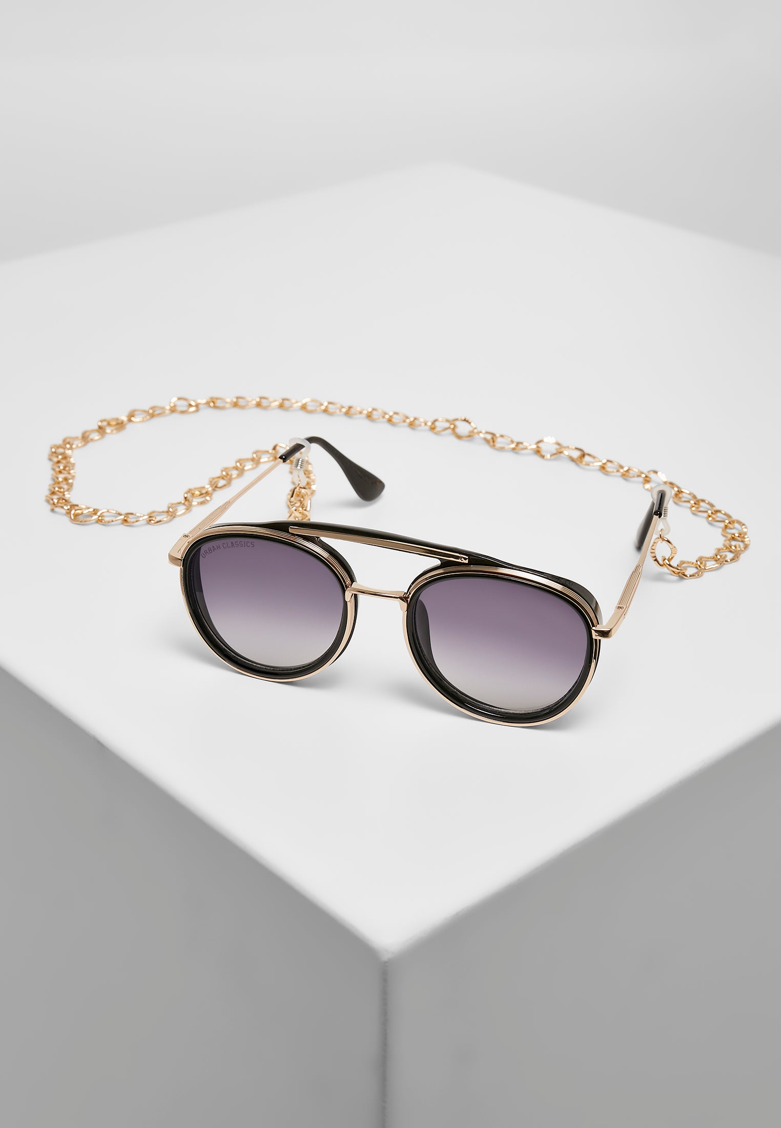 Dessa solglasögon från Urban Classics är ett riktigt blickfång för sommaren. De nästan runda, tonade linserna erbjuder ett pålitligt UV 400 skydd för ögonen. Den metalliska ramen är enkel och elegant med smala sidor, medan näsområdet markeras av en dubbel bro för en subtil detalj. Som en praktisk höjdpunkt levereras glasögonen tillsammans med en matchande curb-chain. Solglasögonen är tillverkade av polykarbonat, koppar och rostfritt stål.