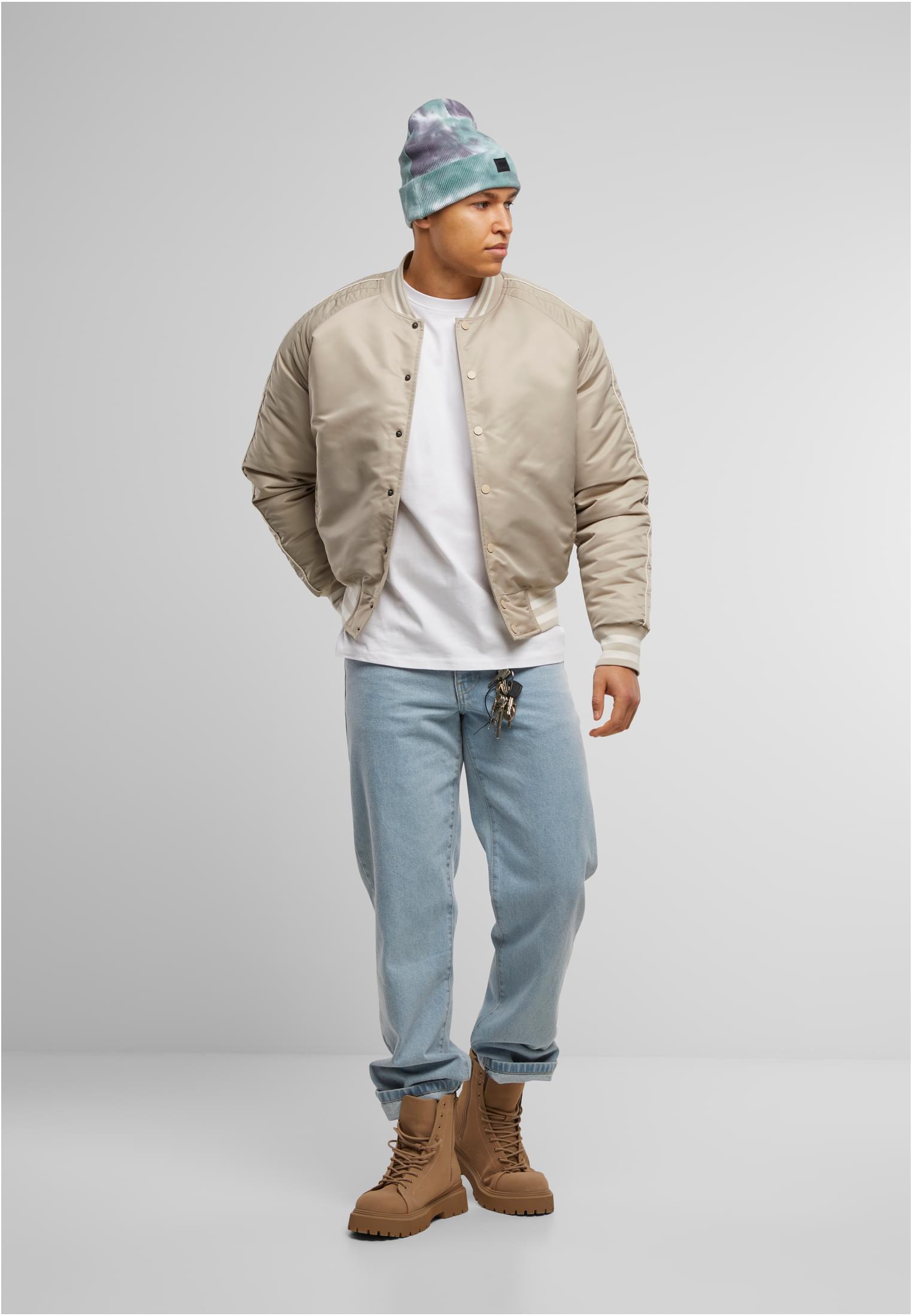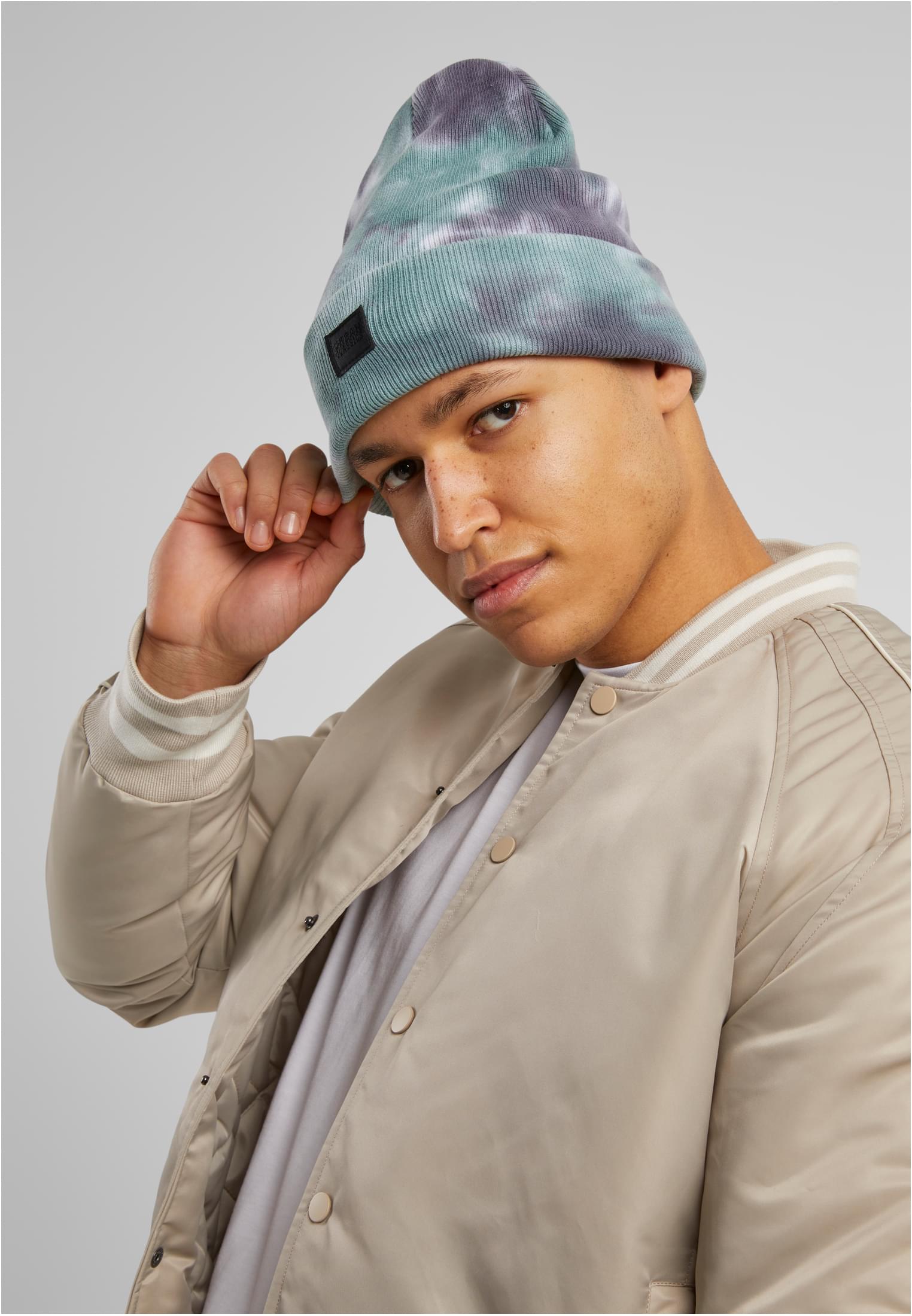 - Design: Tvåfärgat tie dye-mönster, ribbstickad design, vävd Urban Classics etikett