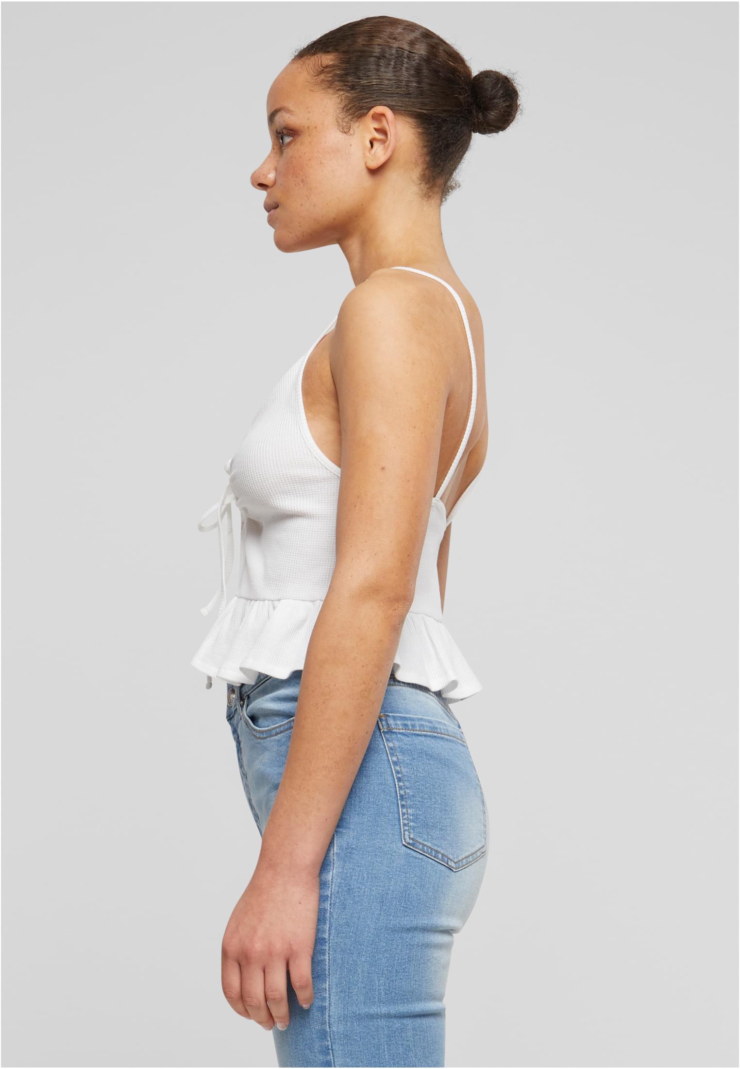 Detta topp i waffle pique är ett perfekt inslag i sommargarderoben med sin feminina och lekfulla design. Den är tillverkad i en mjuk bomullsblandning och kombinerar tunna axelband med en dekorativ knut vid bysten och en volang i nederkant. Toppen bärs lika fint ensam under soliga dagar som under en lätt jacka för en luftig lager-på-lager-look.