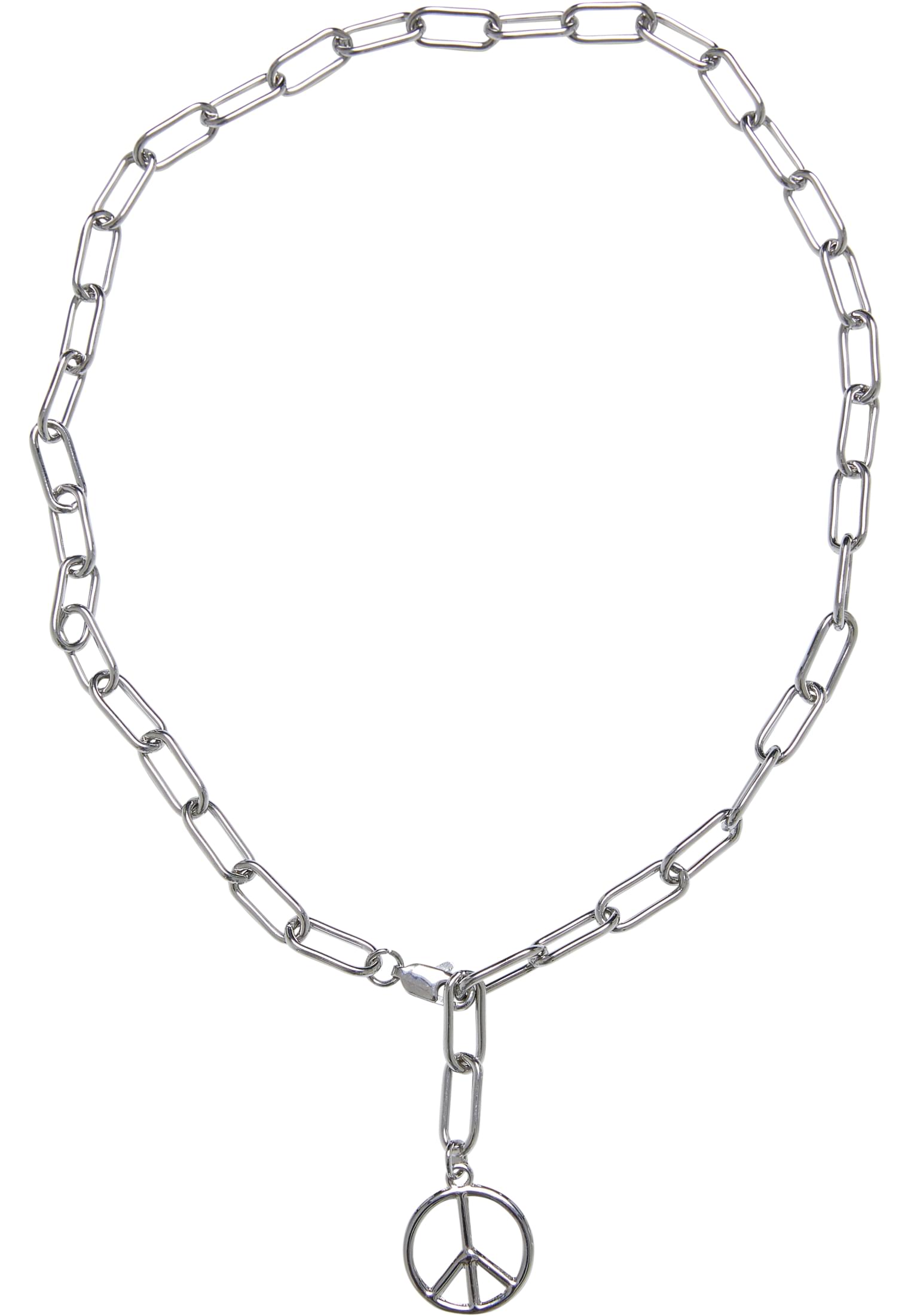 En Y-kedja med stora, avlånga länkar och ett litet hänge i form av ett fredssymbol. Halsbandet kan stängas i mitten – den lilla karbinhaken kan hakas in i varje kedjelänk, vilket gör att storleken kan justeras individuellt. Det fina smycket är tillverkat av järn och zink och passar alla storlekar.